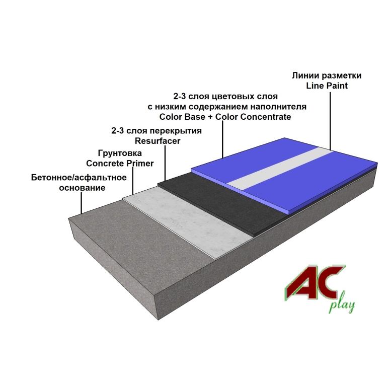 - Грунтовка и ремонтный состав: AC-PLAY Concrete Primer, AC-PLAY Patch Binder.