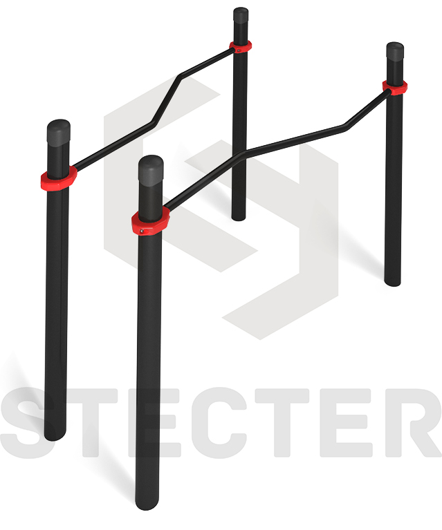 Комплекс состоит из четырех опорных столбов высотой 1200 мм и двух зигзагообразно изогнутых жердей длиной 1790 мм. Расстояние между центрами опорных столбов брусьев: 608 мм - с одной стороны и 1008 мм - с другой стороны. Жерди крепятся к опорным столбам при помощи хомутов на высоте 1000 мм от поверхности основания. Длина комплекса не более 2010 мм.