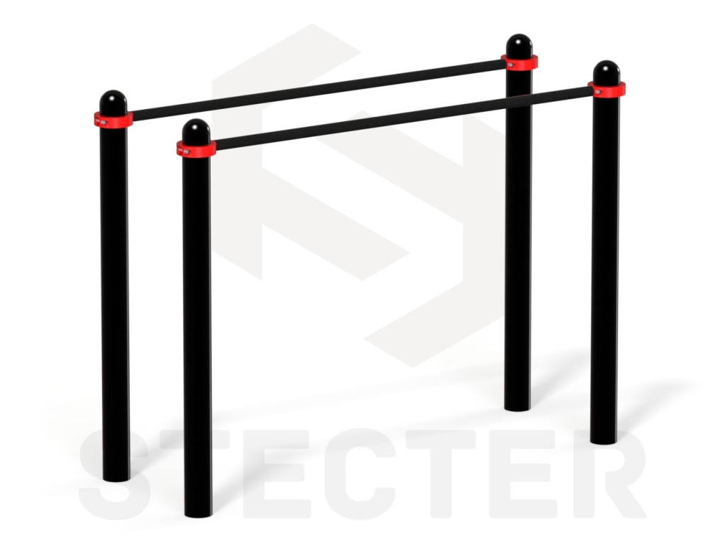 Брусья дают возможность легко организовать как индивидуальные, так и групповые занятия воркаутом на спортивной площадке или в любом дворе. В качестве несущей конструкции используется 4 опорных столба с полусферическими заглушками высотой 1400 миллиметров, между которыми на высоте 1200 мм параллельно друг другу закрепляются стальные жерди с рабочей поверхностью 1800 миллиметров. Диаметр жердей 48 мм. Они производятся из толстостенной трубы, которая обеспечивает повышенную устойчивость к нагрузке.