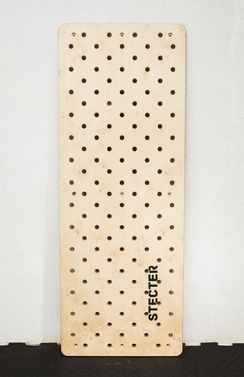 Доска для лазания Пегборд так же широко известна под названием стена Коркина. Это довольно простой и популярный тренажер для развития силы и координации рук. Она крепится на стену. Суть упражнения заключается в том, что атлету необходимо перемещаться по стене, переставляя деревянные колышки в отверстия доски. Доски могут быть различных размеров. Это позволяет закрепить их на стене в произвольном порядке и создать свой индивидуальный маршрут передвижения.