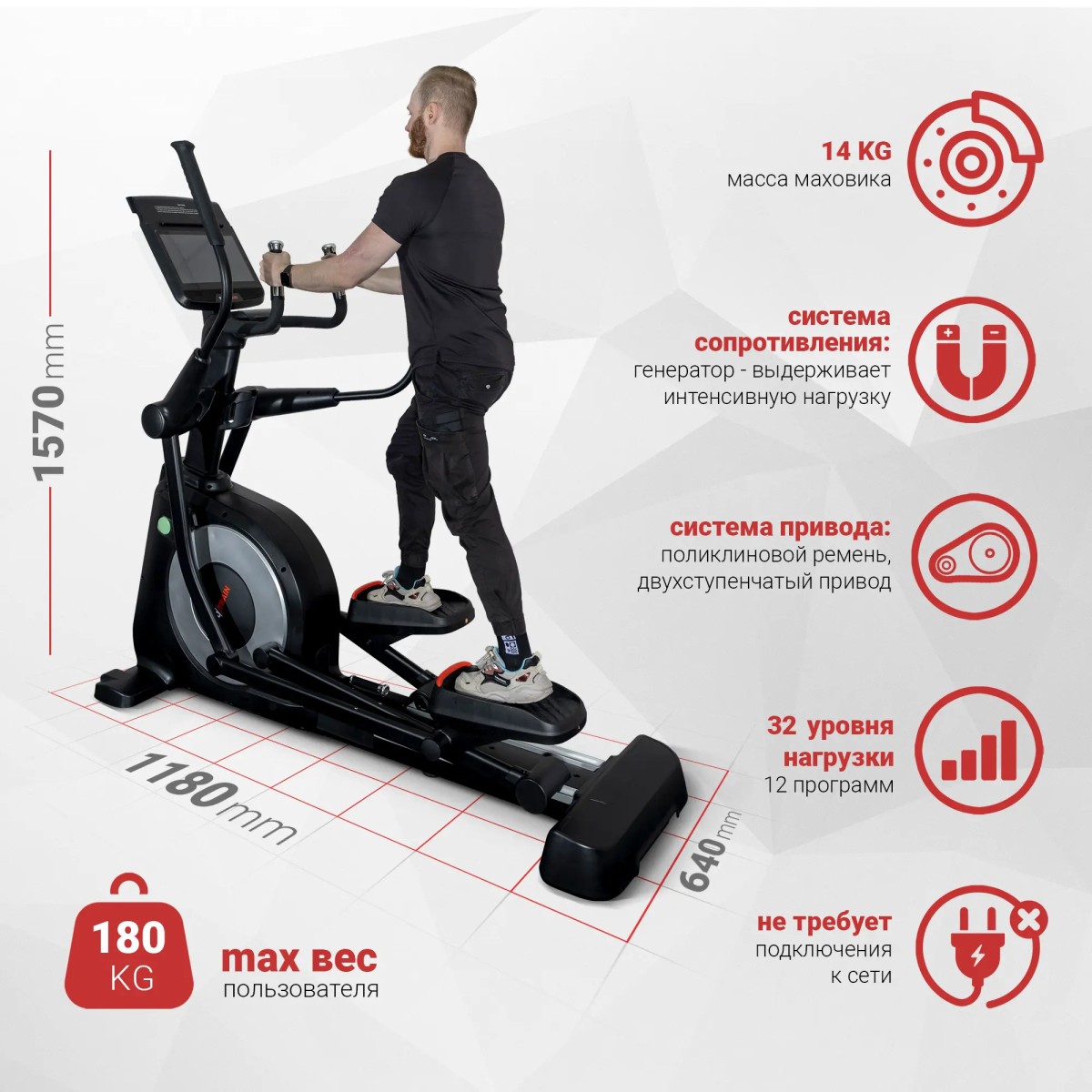 Самогенерирующий механизм не требует подключения к сети. Маховик 14 кг обеспечивает плавный бесшумный ход и надежную работу. Большие педали, покрытые нескользящим материалом, позволяют комфортно тренироваться пользователям весом до 180 кг. Область применения: профессиональная;Количество уровней нагрузки: 32;Максимальный вес пользователя: 180 кг; Консоль: LED-дисплей; Размеры товара в сборе: 202 x 75 x 185 см.