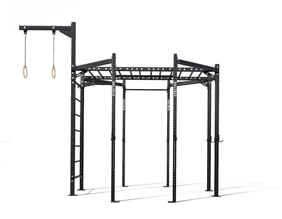 Отличная конфигурация функциональной рамы в форме восьмиугольника экономит место в зале без ущерба для количества рабочих мест атлетов. Конструкция собирается из стоек/балок сечением 80х60 мм и дополняется турниками, рукоходом, кронштейнами для различных подвесных снарядов. Наличие перфорации в стойках и балках позволяет подобрать оптимальный уровень установки элементов в функциональной раме.