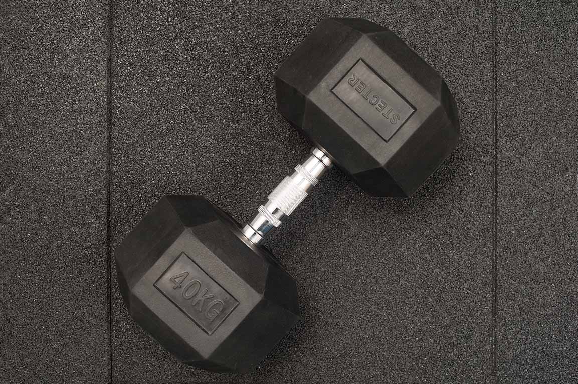 Шестигранная форма утяжелителя предотвращает возможность самостоятельного перемещения гантели по поверхностям, повышая ее устойчивость. Также его обрезиненная поверхность делает снаряд более бесшумным и защищает поверхность пола и самой гантели от царапин.