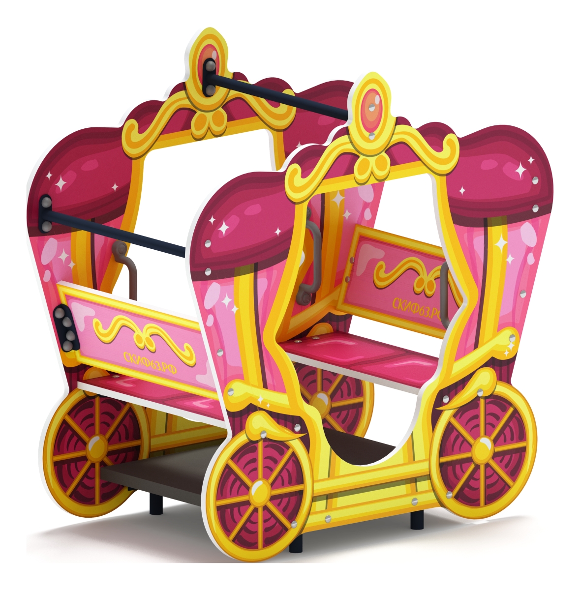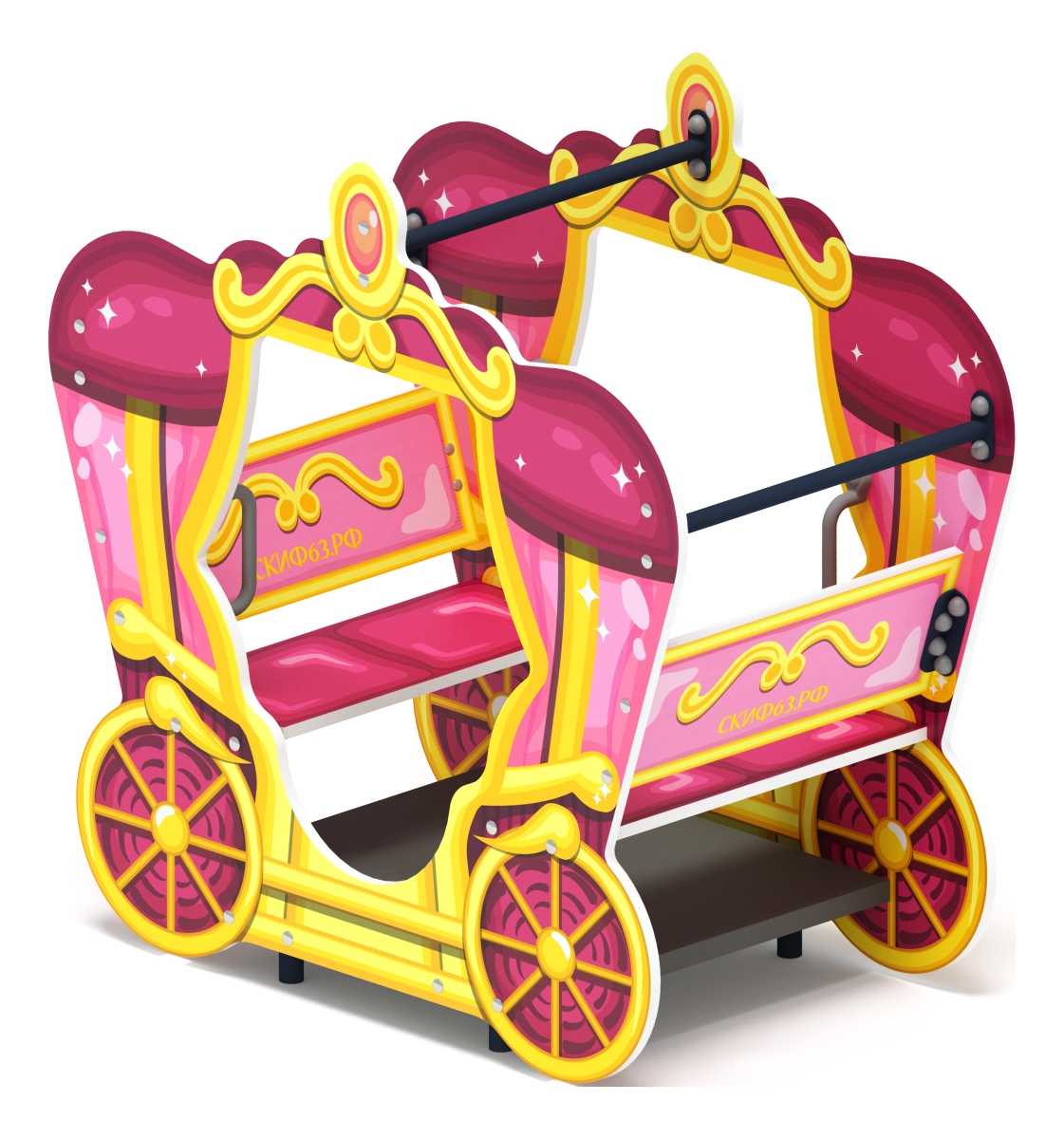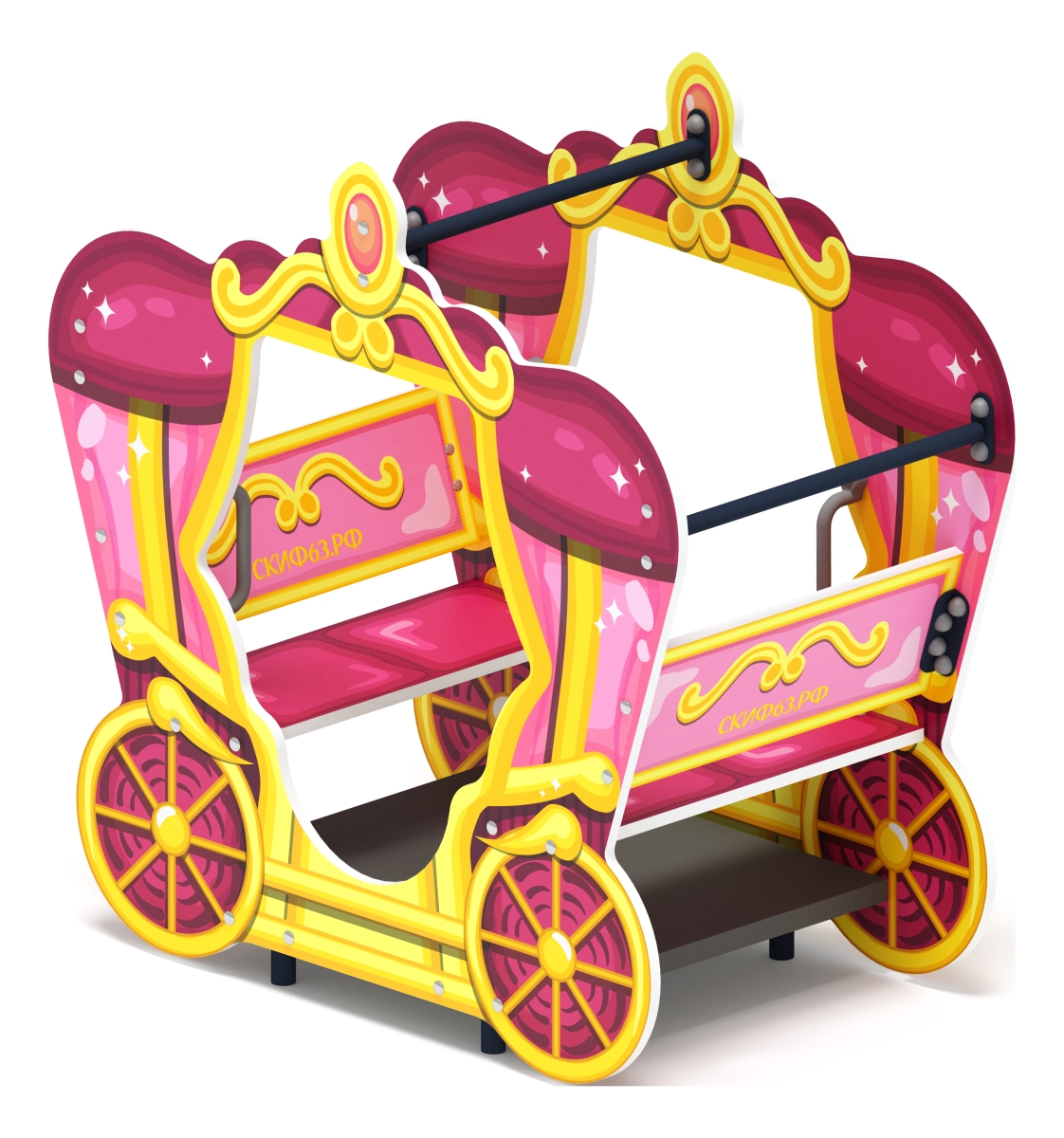 Каждый Ребенок любит кататься в парках на различных повозках, запряженных лошадьми. И хоть в этой карете нет лошадей, но это не уменьшает её интерес для детей. Удобные лавки позволяют её использовать как беседку или как декорацию к одной из многочисленных детских игр. для ребенка так легко включить свое воображение, что он сможет увидеть не только карету запряженную лошадьми, но и замок рядом, куда они мчатся на этой карете
