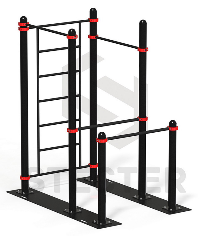 Спортивный комплекс представляет собой сборную металлическую конструкцию состоящую из шести опорных столбов с площадками для крепления к пластинам основания и полусферическими заглушками, двух перекладин длиной L=1090 мм., а так же шведской стенки и двух поручней для брусьев диаметром 42 мм. (длина L=1090 мм). Крепление элементов спортивного комплекса осуществляется хомутами, что позволяет легко и быстро фиксировать их на нужной высоте, а опорных столбов к пластинам основания болтами с полусферической головкой. Разборная конструкция спортивного комплекса имеет высокую прочность и позволяет без особых навыков производить её монтаж и демонтаж. Все элементы покрыты атмосферостойкой порошковой краской, нанесенной методом электростатического напыления с последующим обжигом в печи.