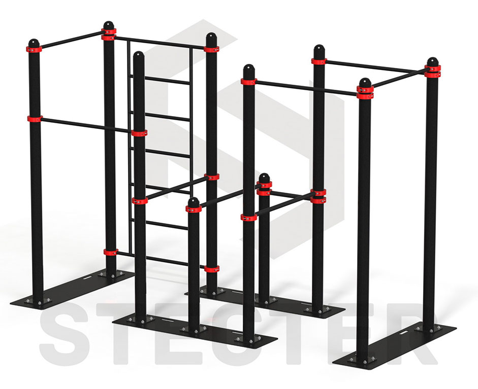 Спортивный комплекс представляет собой сборную металлическую конструкцию состоящую из десяти опорных столбов с площадками для крепления к пластинам основания и полусферическими заглушками, пяти перекладин длиной L=1090 мм., а так же трех поручней для брусьев длиной L=1090 мм (диаметр 42 мм) и шведской стенки. Для большей жесткости опорные столбы брусьев усилены дополнительным поручнем длиной L=490 мм. Крепление элементов спортивного комплекса осуществляется хомутами, что позволяет легко и быстро фиксировать их на нужной высоте, а опорных столбов к пластинам основания болтами с полусферической головкой. Разборная конструкция спортивного комплекса имеет высокую прочность и позволяет без особых навыков производить её монтаж и демонтаж. Все элементы покрыты атмосферостойкой порошковой краской, нанесенной методом электростатического напыления с последующим обжигом в печи.