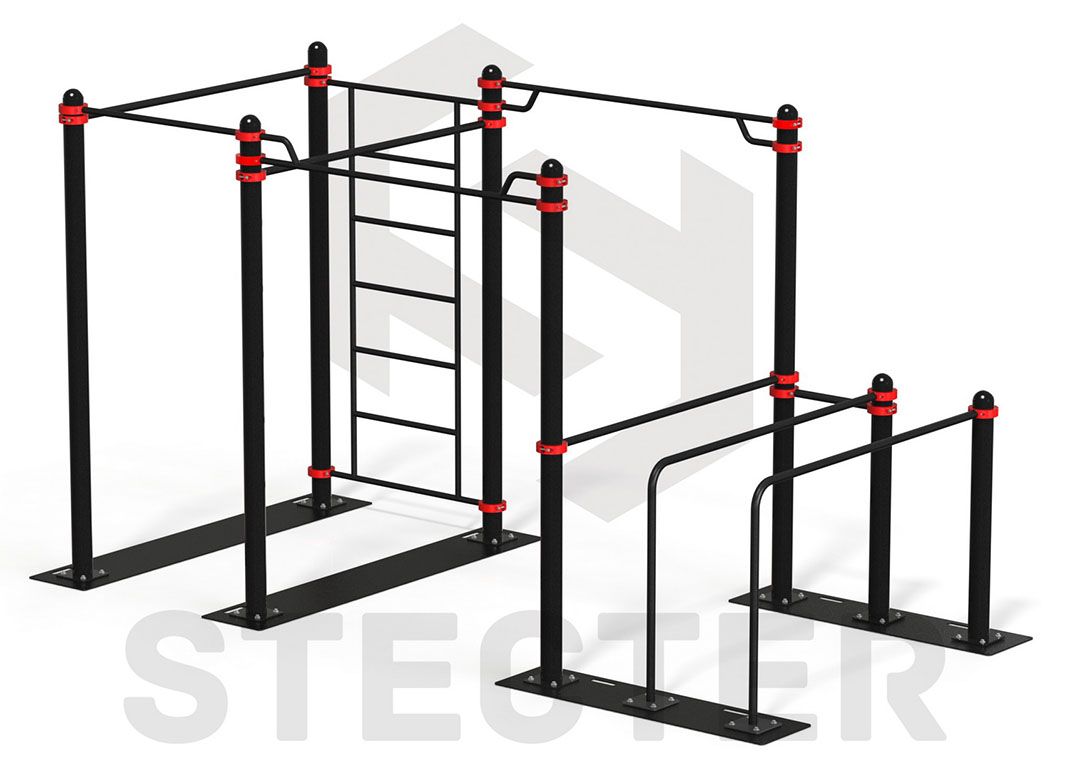 Спортивный комплекс представляет собой сборную металлическую конструкцию состоящую из восьми опорных столбов с площадками для крепления к пластинам основания и полусферическими заглушками, одной перекладиной длиной L=1090 мм., четырех перекладин длиной L=1785 мм., а так же состоит из брусьев и шведской стенки. Для большей жесткости опорные столбы брусьев усилены дополнительным поручнем длиной L=490 мм. Крепление элементов спортивного комплекса осуществляется хомутами, что позволяет легко и быстро фиксировать их на нужной высоте, а опорных столбов к пластинам основания болтами с полусферической головкой. Разборная конструкция спортивного комплекса имеет высокую прочность и позволяет без особых навыков производить её монтаж и демонтаж. Все элементы покрыты атмосферостойкой порошковой краской, нанесенной методом электростатического напыления с последующим обжигом в печи.