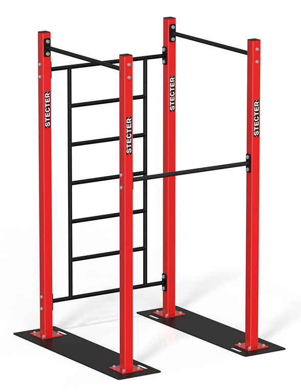 Спортивный комплекс, представляет собой сборную металлическую конструкцию состоящую из четырех опорных столбов трубы квадратного профиля, с приварными площадками для крепления к пластинам основания, трех перекладин длиной L=1120 мм. установленных на различной высоте (изменение положения высоты перекладин производится за счет дополнительно предусмотренных отверстий в опорных столбах), а так же включает в себя шведскую стенку. Монтаж элементов спортивного комплекса осуществляется с помощью болтового соединения. К каждому опорному столбу по два болтовых соединения на один элемент комплекса. Разборная конструкция спортивного комплекса имеет высокую прочность и позволяет легко производить её монтаж и демонтаж. Все элементы покрыты атмосферостойкой порошковой краской, нанесенной методом электростатического напыления с последующим обжигом в печи.