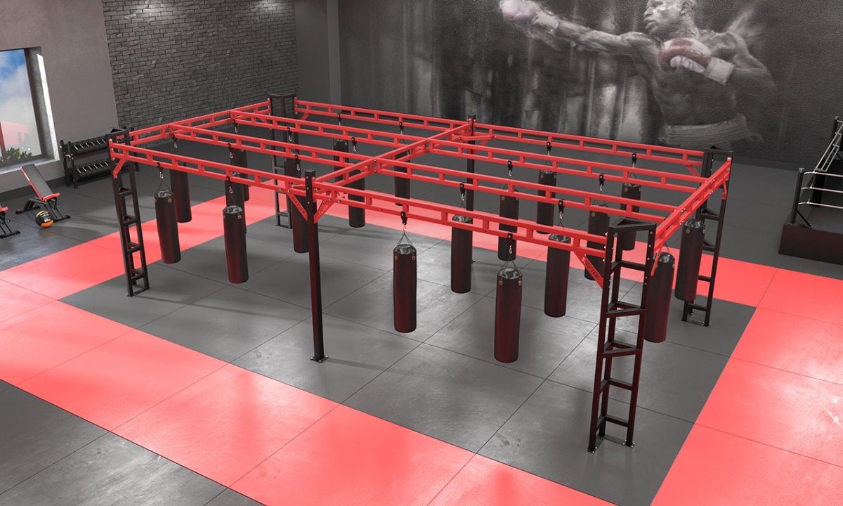 Вся конструкция получила максимальную «круговую обвязку» для уменьшения раскачки в ходе тренировок. Элементы боксерской рамы окрашиваются порошковой краской и запекаются в печи при высокой температуре. Купить боксерскую раму Вы можете в нашем магазине. Расчетное количество боксерских мешков – 20 штук.
