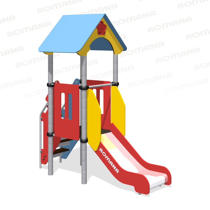 Детская площадка «Romana 104.03.00» - это небольшой домик-горка для малышей, которые впервые знакомятся с горкой. Может разместиться на дачном участке.