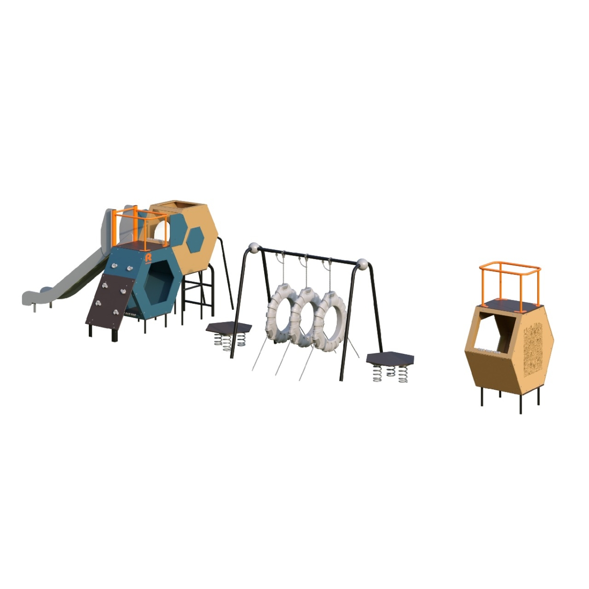 Детская площадка Romana – это игровой комплекс для улицы, который состоит из трех объемных шестигранников, связанных разнообразными переходами. Один из шестигранников оснащен увлекательными элементами – горкой и лазом, что делает площадку еще более интересной для детей. Переходы между шестигранниками созданы в виде игровых лазов со стойками, а для предотвращения травм и вандализма стыки защищены специальными сферами. Некоторые переходы работают по принципу батута, предоставляя детям возможность весело прыгать и развивать координацию. Для обеспечения безопасности предусмотрены ограждения, которые удобно обхватывать руками, обеспечивая надежную поддержку и защиту от падений. Все элементы комплекса, кроме ограждений и крепления горки, прочно закреплены на грунтозацепах, что гарантирует устойчивость и долговечность конструкции даже при активной эксплуатации.