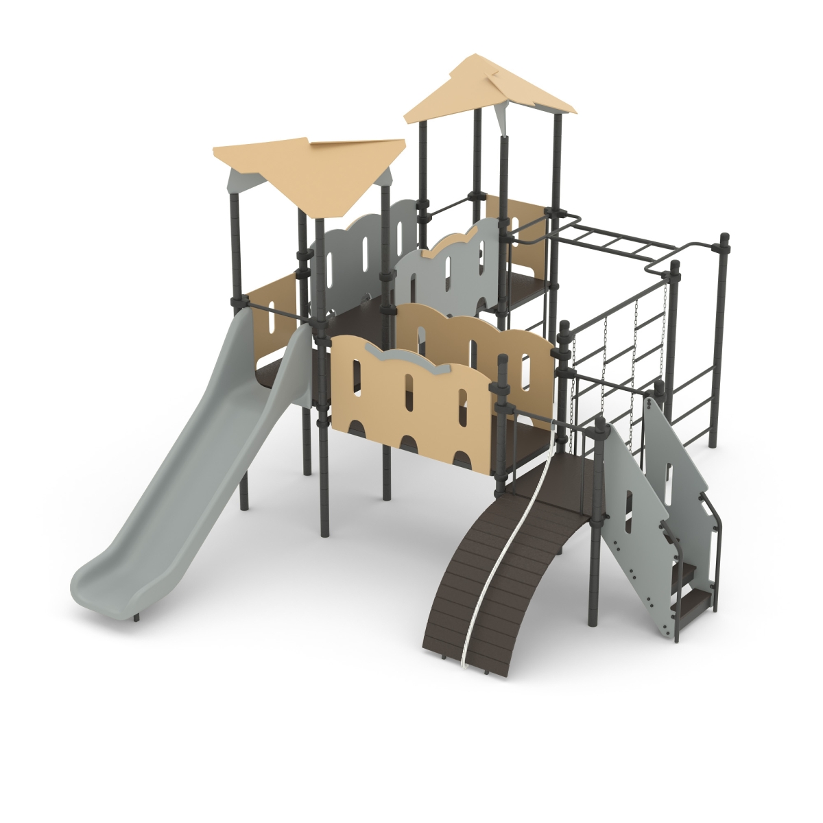 Игровой комплекс для тематических игр и физического развития предназначен для детей в возрасте от 8 лет. Изделие представляет собой сборно-разборную каркасную конструкцию из металлических труб, установленную на забетонированные стойки.