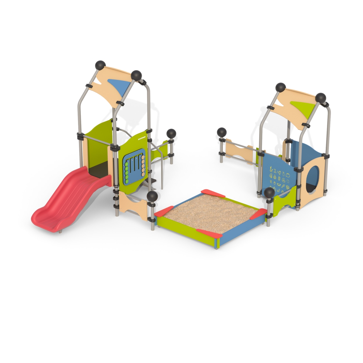 Это игровое оборудование изготовлено для оснащения уличных детских площадок. В составе есть: