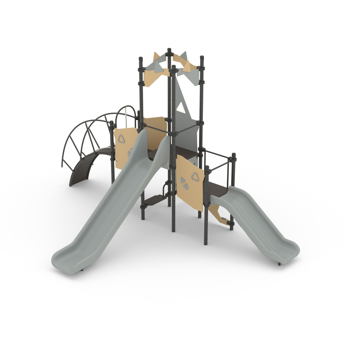 Детский игровой комплекс Romana 101.116.00 — многофункциональная площадка размером 6080 x 4372 x 3744 мм, предназначенная для активного отдыха детей младшего школьного возраста — 6-12 лет. Конструкция из металла и влагостойкой фанеры включает две игровые площадки, две горки (950 мм и 1550 мм), различные виды ограждений, панели-лазы, крыши, бизиборд и выгнутый лаз. Особенности: стойки с системой хомутов для точной сборки, антискользящее покрытие настилов, порошковое покрытие металла. Безопасность обеспечивается соответствием комплекса ГОСТ 34614.1-2019, закругленными элементами и декоративными заглушками. Модель способствует физическому развитию, улучшает координацию и социальные навыки детей. Отлично подходит для установки в парках, школах, на территориях жилых комплексов.