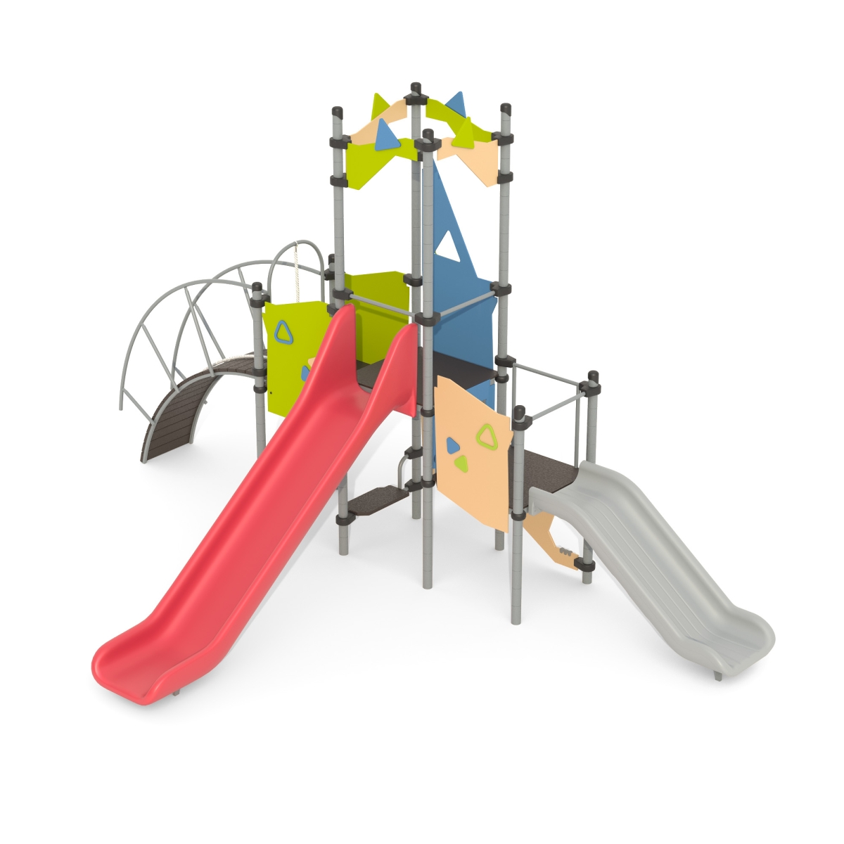 Детский игровой комплекс Romana 101.116.00 — многофункциональная площадка размером 6080 x 4372 x 3744 мм, предназначенная для активного отдыха детей младшего школьного возраста — 6-12 лет. Конструкция из металла и влагостойкой фанеры включает две игровые площадки, две горки (950 мм и 1550 мм), различные виды ограждений, панели-лазы, крыши, бизиборд и выгнутый лаз. Особенности: стойки с системой хомутов для точной сборки, антискользящее покрытие настилов, порошковое покрытие металла. Безопасность обеспечивается соответствием комплекса ГОСТ 34614.1-2019, закругленными элементами и декоративными заглушками. Модель способствует физическому развитию, улучшает координацию и социальные навыки детей. Отлично подходит для установки в парках, школах, на территориях жилых комплексов.