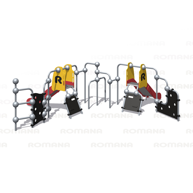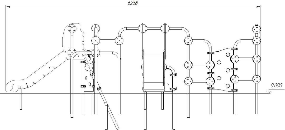 Выполнен в виде металлических стоек из 057 трубы, соединенный шарами, имеются 2 горки h=950 мм., лазы.