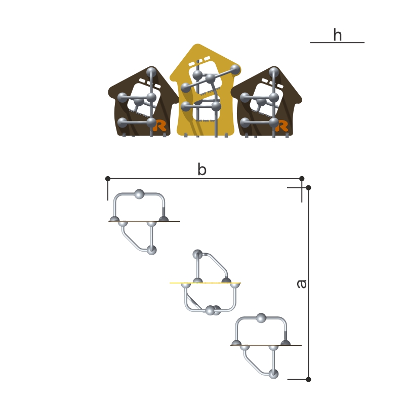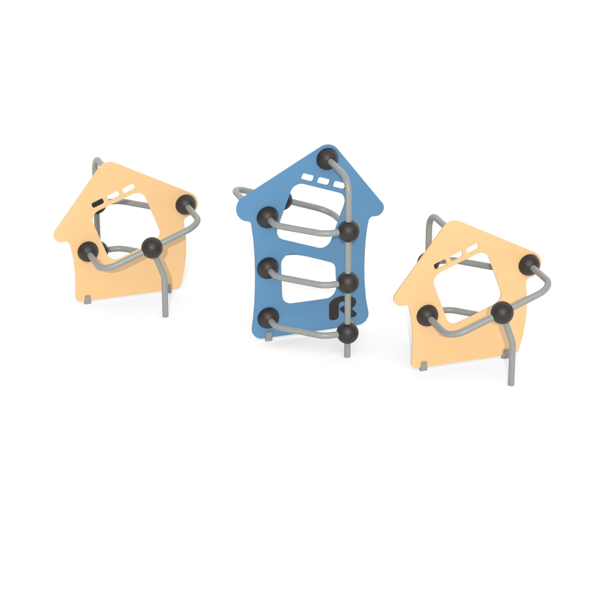 Комплекс состоит из 3 элементов, каждый элемент выполнен в виде металлических стоек из 057 трубы, фанеры в виде домика, скрепленных между собой сферами.