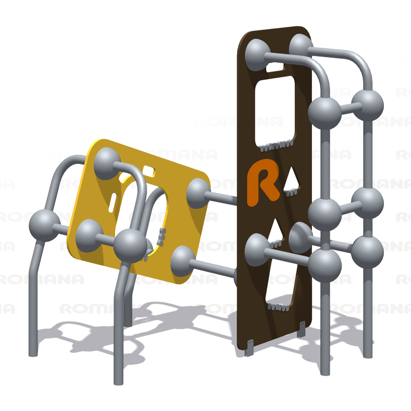 Комплекс выполнен в виде металлических стоек из 057 трубы, фанеры, скрепленных между собой сферами.