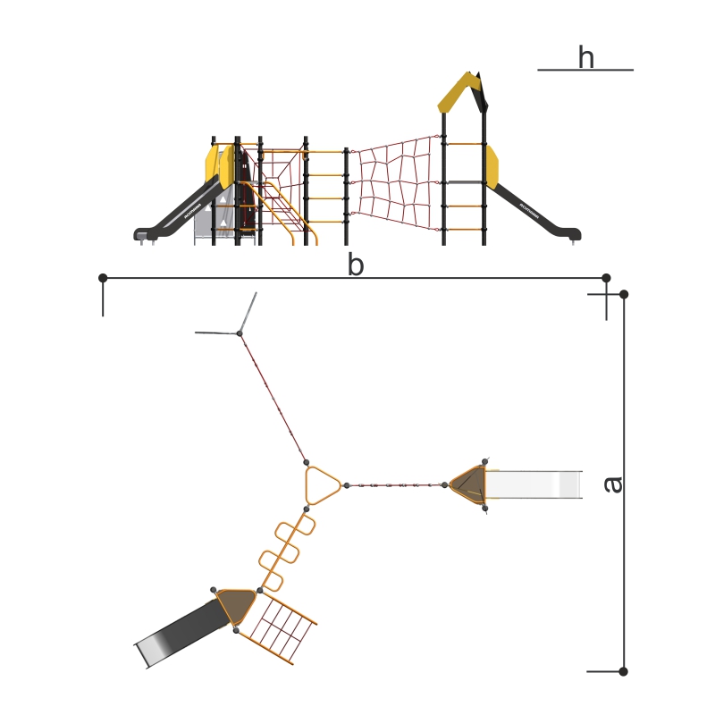 Выполнен в виде металлических стоек, образующих треугольник, к стойкам прикреплены канатный лаз, панель-лаз, горка, лаз-змейка.