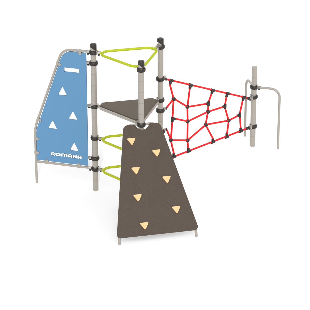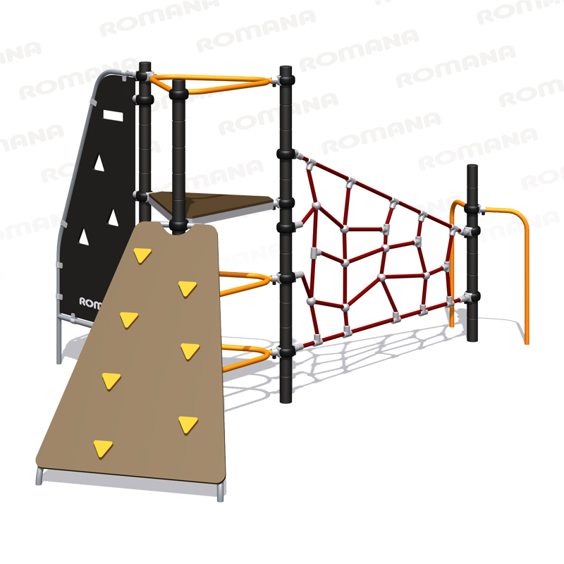 Спортивно - игровой комплекс для тематических игр и физического развития предназначен для детей в возрасте от 8 до 12 лет. Изделие представляет собой устойчивую конструкцию, обеспечивающую безопасные условия для занятий на открытом воздухе. Конструкция обладает высокой ударопрочностью и виброустойчивостью.Выполнен в виде металлических стоек, образующих треугольник, к стойкам прикреплены канатный лаз, панель-лаз и трап с зацепами.