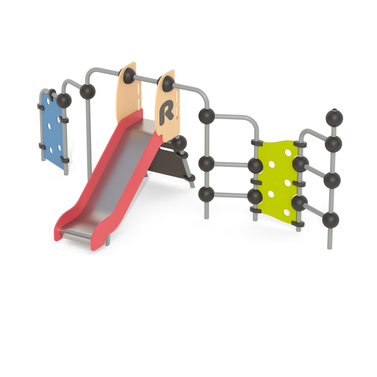 Выполнен в виде металлических стоек из 057 трубы, соединенный шарами, имеется горка h=950 мм., лазы.