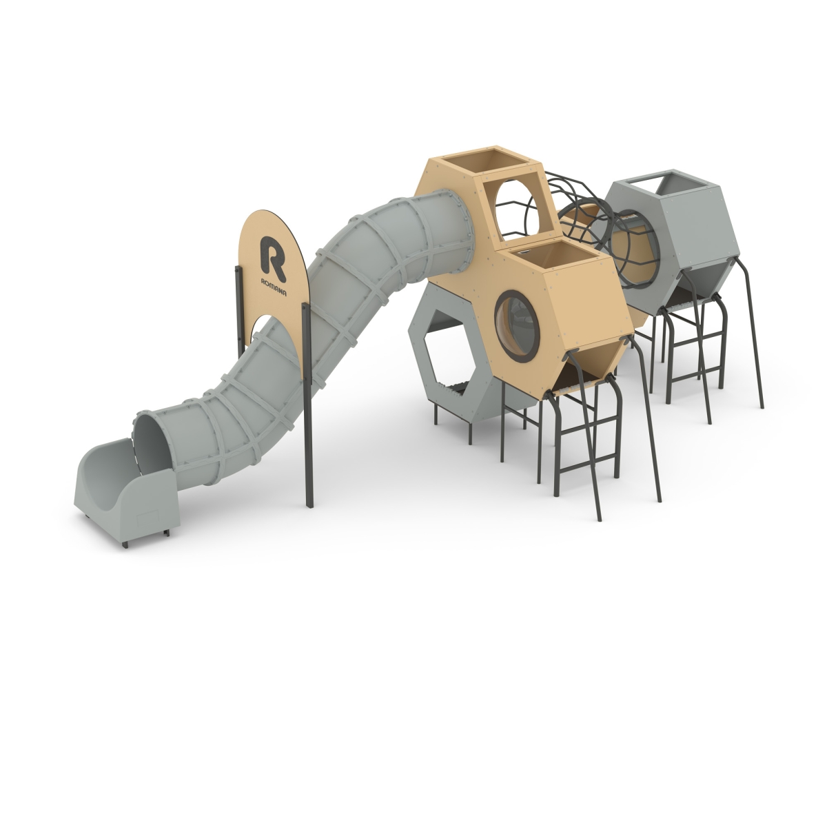 Спортивный игровой комплекс для улицы из фанеры и металла представляет собой прочную и безопасную конструкцию для активных игр на свежем воздухе. Он включает пять объемных шестигранников, соединенных переходами, а также горку и лазательные элементы. Для безопасности установлены ограждения. Они предотвращают случайные падения с высоты. Конструкция крепится с помощью бетонирования. Торцы труб и выступающие элементы снабжены защитными пластиковыми заглушками для предотвращения травм. Все крепежные элементы выполнены из антикоррозионных материалов. Металлические части окрашены полимерной порошковой эмалью, а фанерные элементы — краской на основе акрилата. Поэтому комплекс устойчив к погодным условиям и износу.