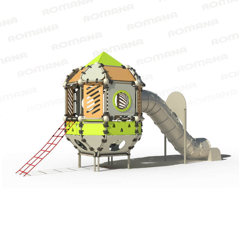В комплекс входят: модуль в виде башни, закрытая горка тоннельного типа с канатным лазом из полипропиленовых армированных нитей для доступа на горку.