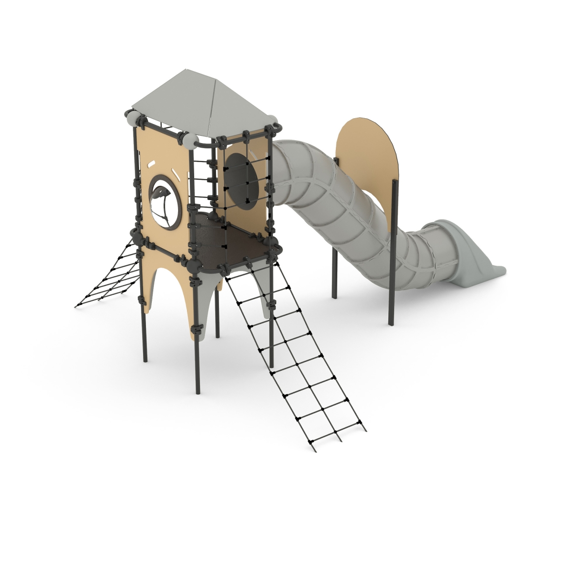 В сборе состоит из: модуля в форме башни с веревочными лестницами, закрытой горки тоннельного типа с канатной лестницей.