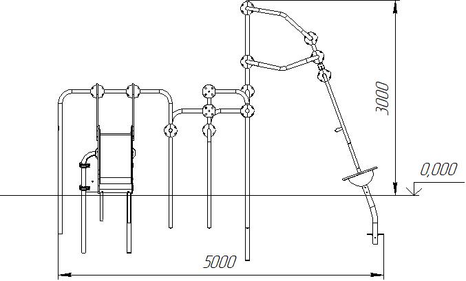 Выполнен в виде металлических стоек из 057 трубы, соединенный шарами, имеется горка h=950 мм. и одноместная карусель.