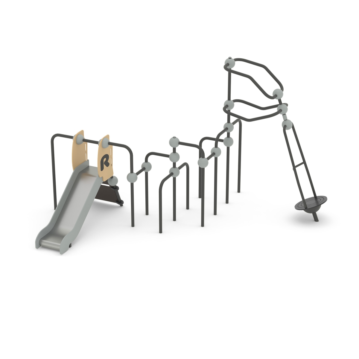 Выполнен в виде металлических стоек из 057 трубы, соединенный шарами, имеется горка h=950 мм. и одноместная карусель.