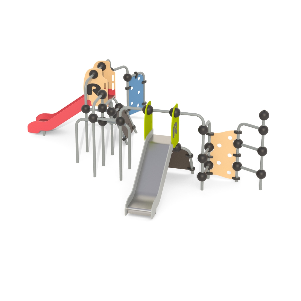 Выполнен в виде металлических стоек из 057 трубы, соединенный шарами, имеются 2 горки h=950 мм., лазы.