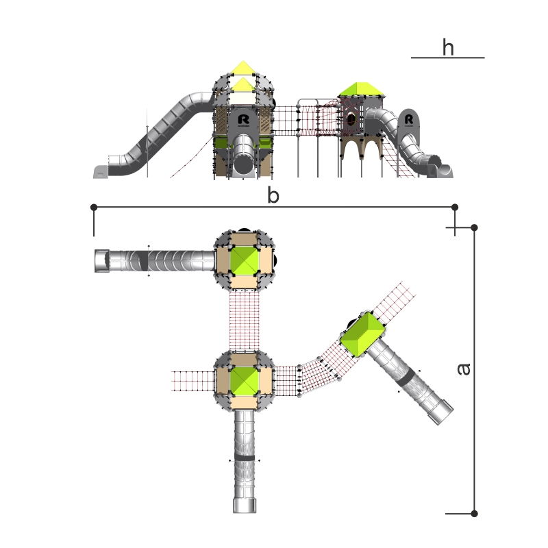 Комплекс с тремя башнями оснащен двумя канатными лестницами для доступа на стартовую площадку, тремя туннельными горками закрытого типа и канатными туннелями.