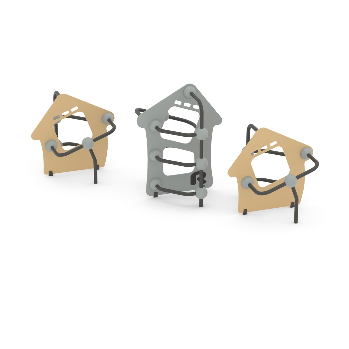 Комплекс состоит из 3 элементов, каждый элемент выполнен в виде металлических стоек из 057 трубы, фанеры в виде домика, скрепленных между собой сферами.