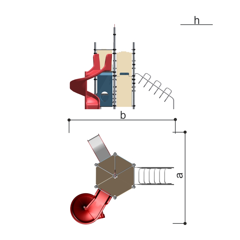 Игровой комплекс для тематических игр и физического развития предназначен для детей в возрасте от 4 лет. Изделие представляет собой сборно-разборную каркасную конструкцию из металлических труб, установленную на забетонированные стойки.