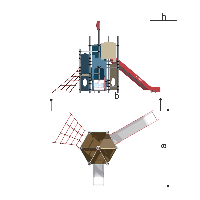 Игровой комплекс для тематических игр и физического развития предназначен для детей в возрасте от 4 лет. Изделие представляет собой сборно-разборную каркасную конструкцию из металлических труб, установленную на забетонированные стойки.