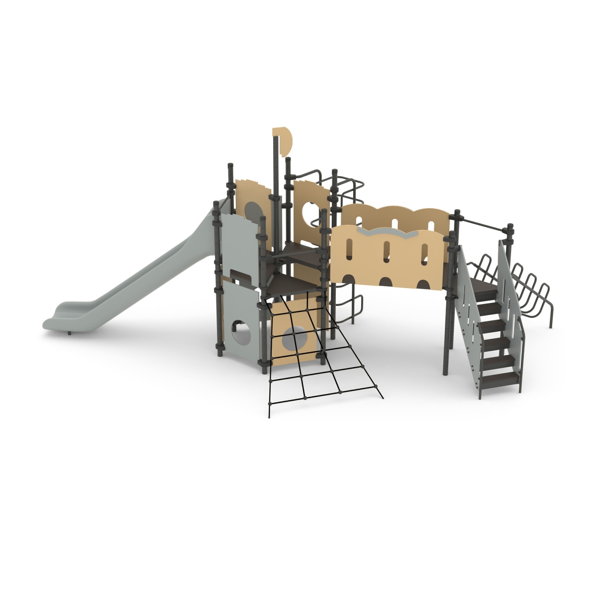 Игровой комплекс для тематических игр и физического развития предназначен для детей в возрасте от 4 лет. Изделие представляет собой сборно-разборную каркасную конструкцию из металлических труб, установленную на забетонированные стойки.