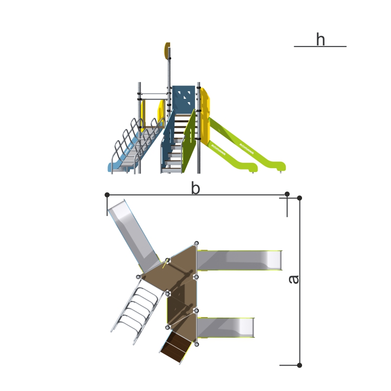 Игровой комплекс для тематических игр и физического развития предназначен для детей в возрасте от 4 лет. Изделие представляет собой сборно-разборную каркасную конструкцию из металлических труб, установленную на забетонированные стойки.