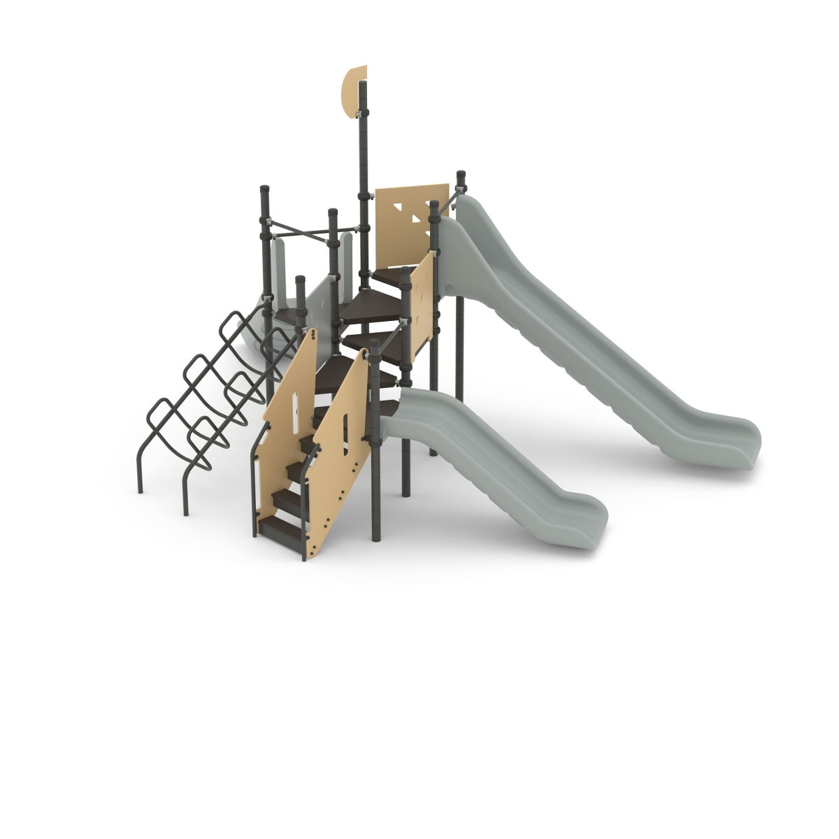 Игровой комплекс для тематических игр и физического развития предназначен для детей в возрасте от 4 лет. Изделие представляет собой сборно-разборную каркасную конструкцию из металлических труб, установленную на забетонированные стойки.