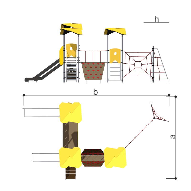 Игровой комплекс для тематических игр и физического развития предназначен для детей в возрасте от 4 лет. Изделие представляет собой сборно-разборную каркасную конструкцию из металлических труб, установленную на забетонированные стойки.