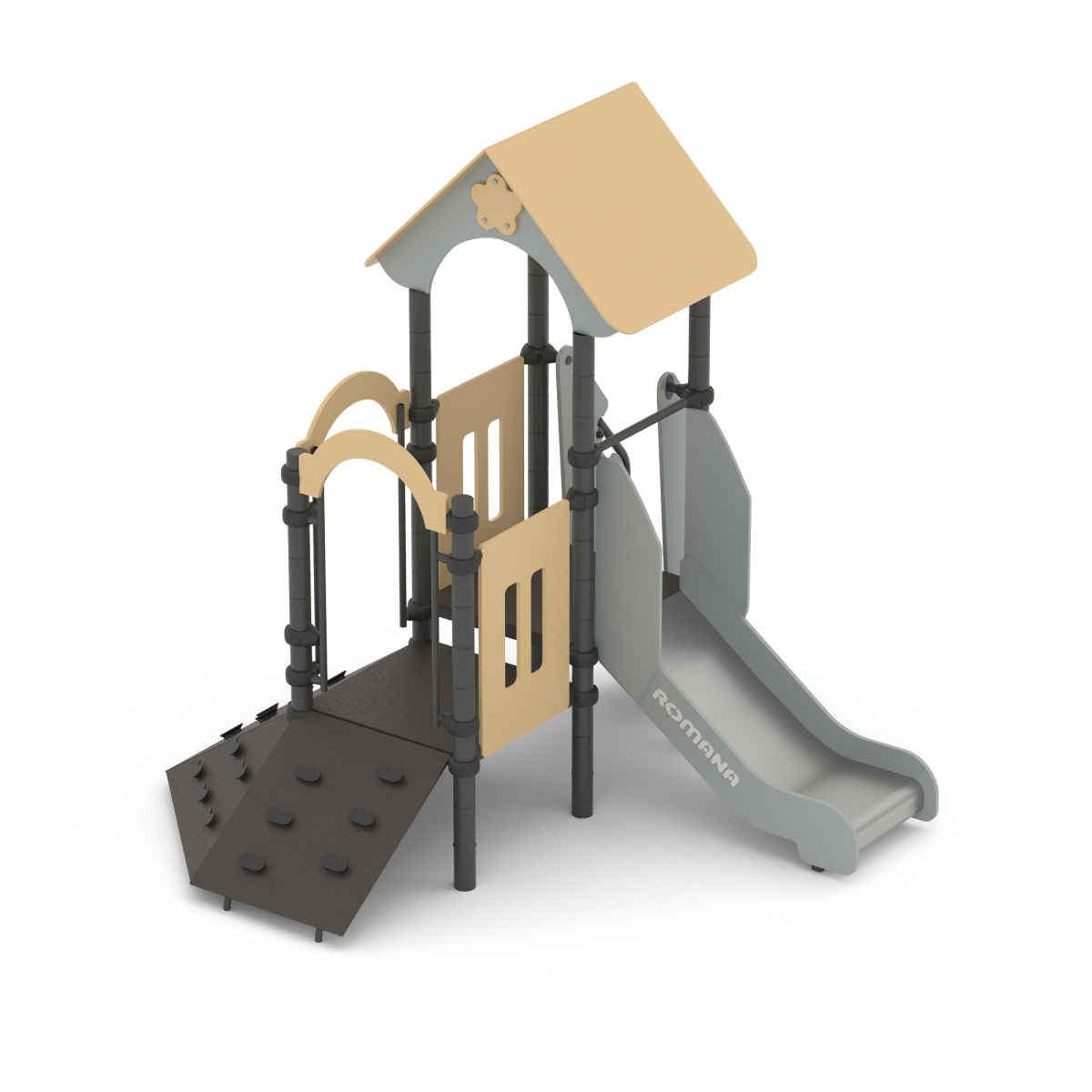 Детская площадка «Romana 104.05.00»- это небольшой домик- горка со скаладромом. Помогает развивать у детей гибкость, ловкость и укреплять мышцы. Подходит для любых площадок.