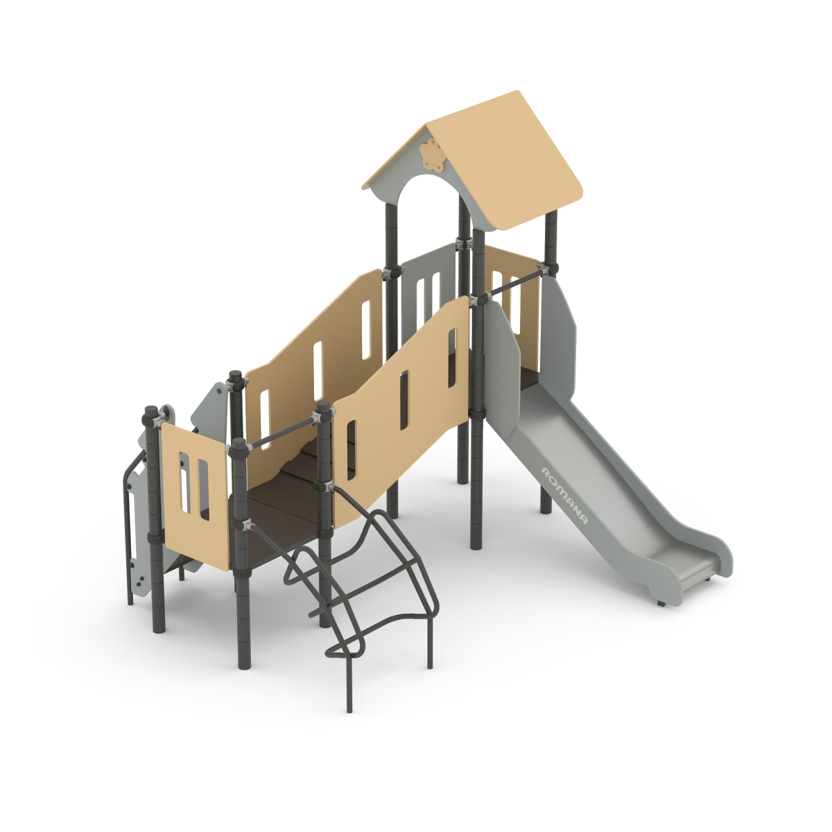 Детская площадка «Romana 104.18.00» с домиком-горкой, горкой и переходом, подходит для небольших площадок на территории детских садов и дворовых площадок, на дачном участке. Позволяет детям развивать координацию и ловкость.