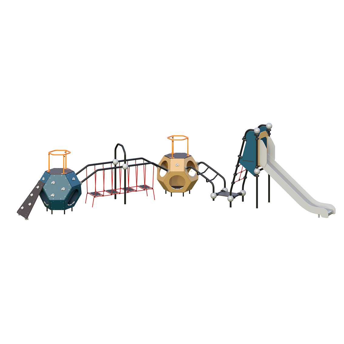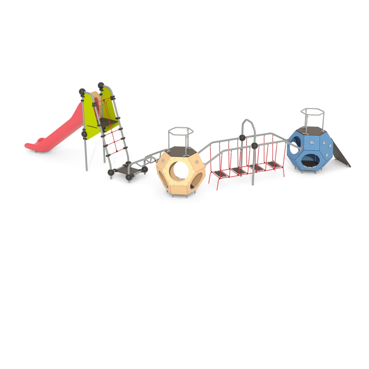 Игровой комплекс Romana 115.88.00 предназначен для детей 7-14 лет. Конструкция устанавливается в местах общего пользования, например на территории торгово-развлекательного комплекса или во дворах жилых домов. Игровой комплекс состоит из двух додекаэдров, соединительной лестницы и горки. Конструкция устойчивая, надежная и безопасная. Дети могут играть в подвижные игры не опасаясь испортить одежду и получить травму. Габариты конструкции: