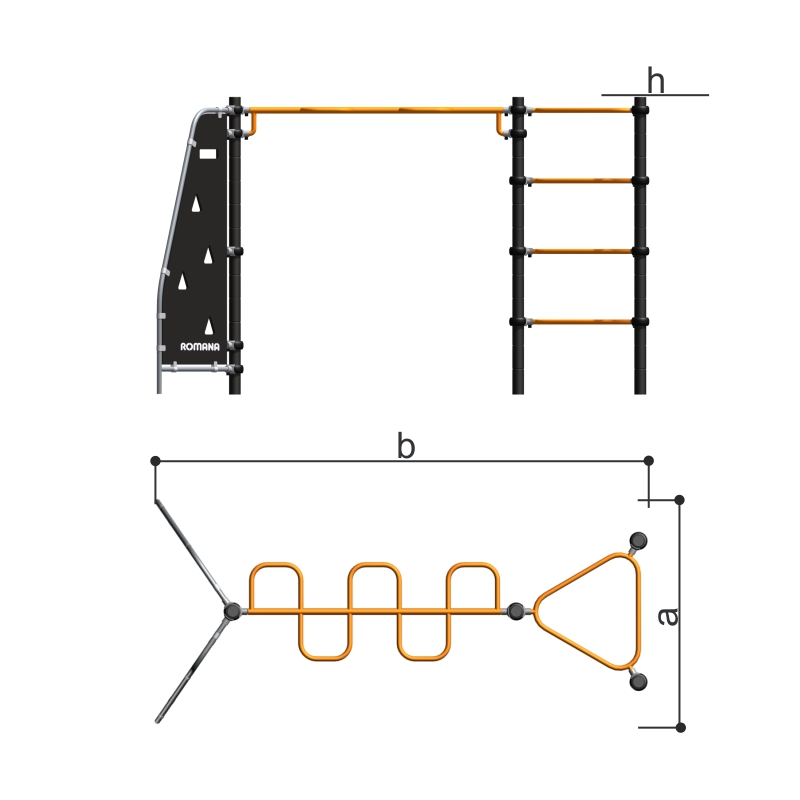 Выполнен в виде металлических стоек, образующих треугольник, к стойкам прикреплены лаз змейка, панель-лаз.