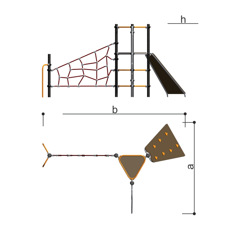 Выполнен в виде металлических стоек, образующих треугольник, к стойкам прикреплены канатный лаз, панель-лаз и трап с зацепами.