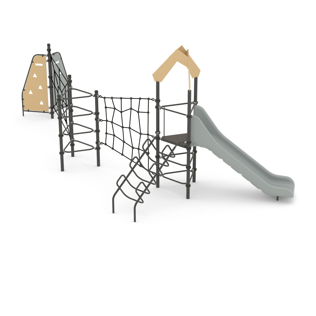 Выполнен в виде металлических стоек, образующих треугольник, к стойкам прикреплены канатный лаз, панель-лаз, горка.