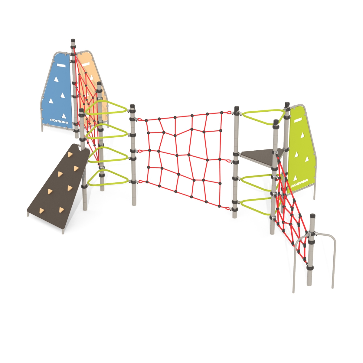 Выполнен в виде металлических стоек, образующих треугольник, к стойкам прикреплены канатный лаз, панель-лаз, горка, трап.