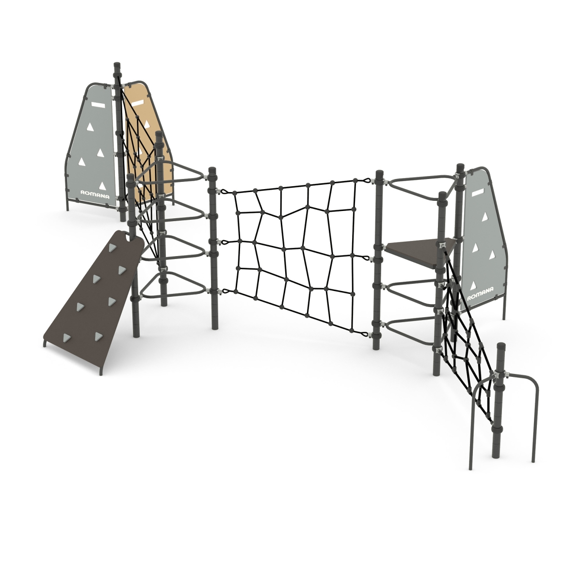 Выполнен в виде металлических стоек, образующих треугольник, к стойкам прикреплены канатный лаз, панель-лаз, горка, трап.