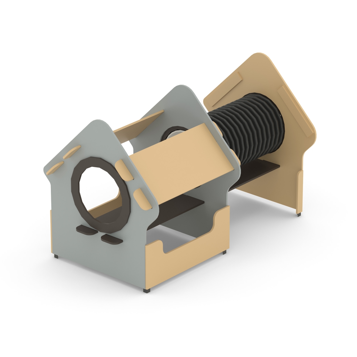 Игровой модуль для тематических игр и физического развития предназначен для детей в возрасте от 4 до 8 лет. Изделие должно представлять собой устойчивую конструкцию, обеспечивающую безопасные условия для занятий на открытом воздухе. Конструкция должна обладать высокой ударопрочностью и виброустойчивостью.В сборе представляет собой конструкцию в виде домика с отверстиями лазами и гофрированной трубой.Изделие устанавливается на открытых уличных участках, находящихся под контролем ответственного лица – эксплуатанта. Установка Изделия должна проводится на ровной площадке, свободной от насаждений. В зоне приземления должно быть ударопоглощающее покрытие (песок, древесные опилки) минимальной толщиной 300 мм.