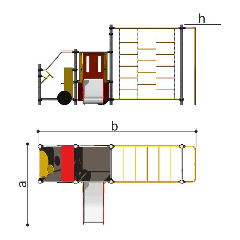 Изделие состоит из кабины Пожарной машины, за которой расположена площадка с горкой (h=650 мм), и рукоход, расположенный между стойками площадки и двухстоечной лестницей на высоте не более 1960 мм. над уровнем земли.