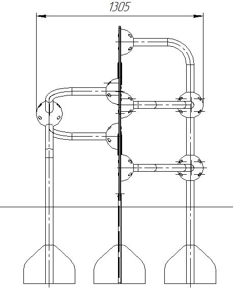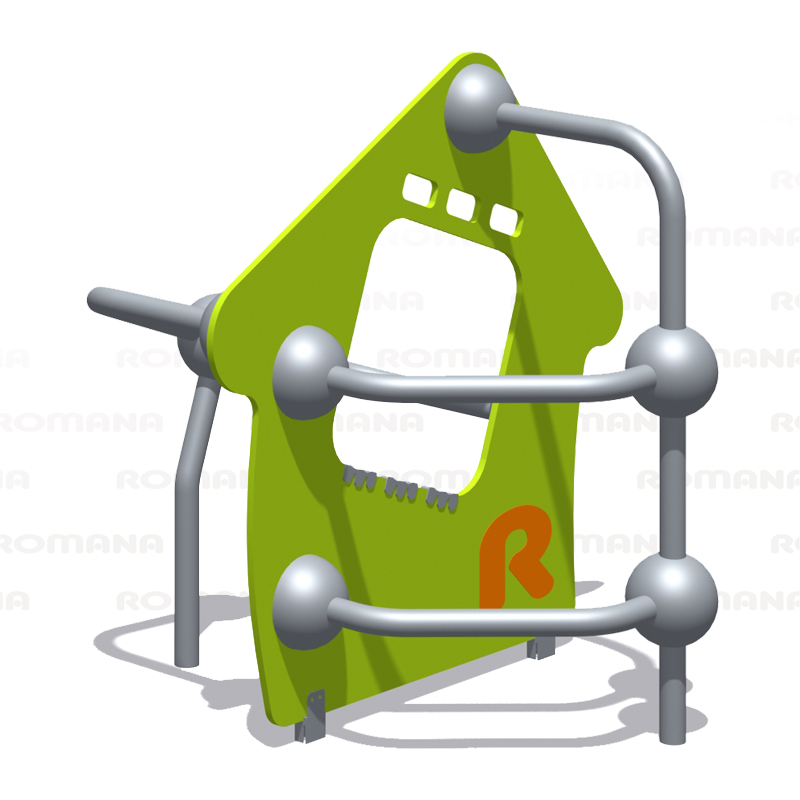 Выполнен в виде металлических стоек из 057 трубы, фанеры в виде домика, скрепленных между собой сферами.